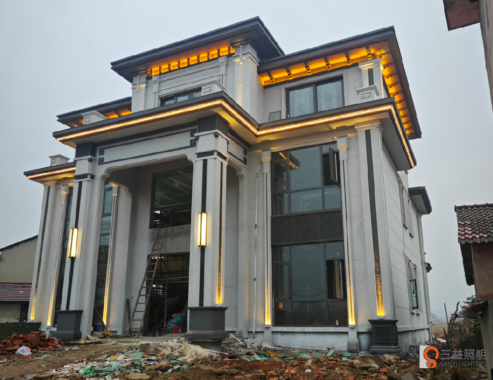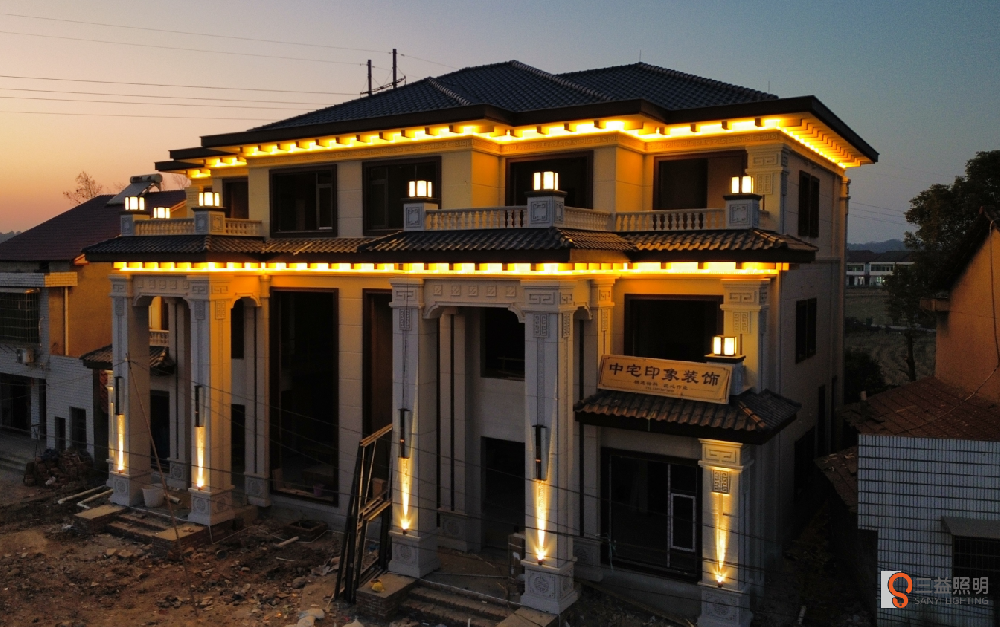 大福劉府是三層新中式別墅,外墻使用藝術(shù)仿石漆,搭配暖白色燈光,效果溫馨又豪氣。